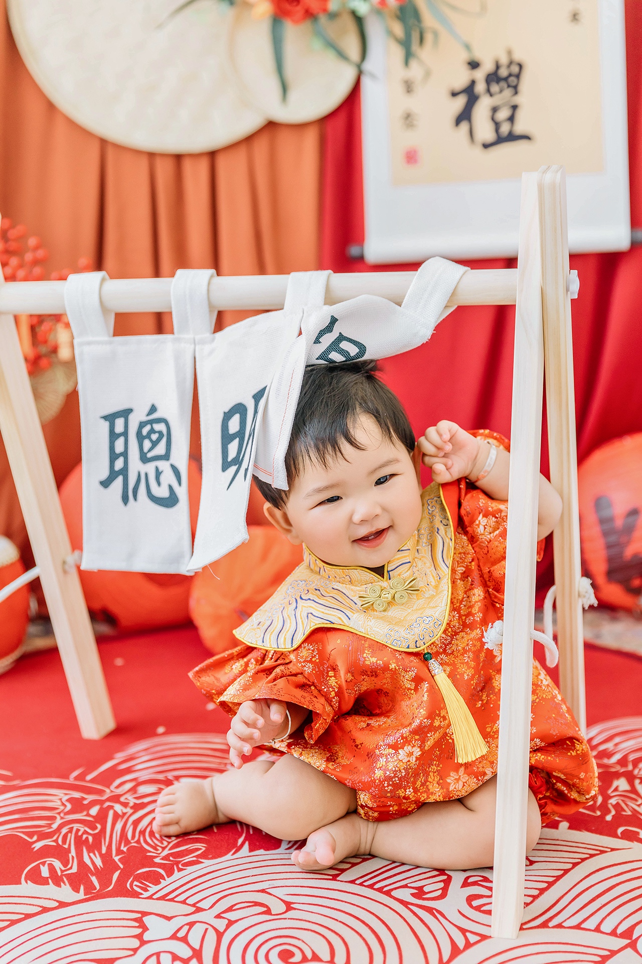 1.服装1套 精修16张 底片全送 一本相册 一个摆台 2.带字面条 一个小蛇果 两根小葱 一小把大米 一个煮好的鸡蛋 手足印需要自行准备 3.周岁拍摄可以带点小零食或者玩具
